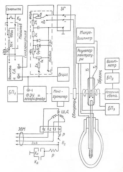 Фотоприемником служит ФЭУ‑62, синхронизированный звуковым генератором ЗГ. Для смещения начала отсчета коэффициента поглощения блок имитатора создает сигнал, аналогичный сигналу от логарифматора. Напряжение с выхода логарифматора регистрируется либо на самописце, либо в АЦП ЭВМ.
