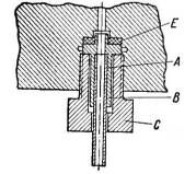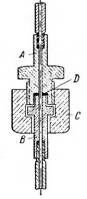 С помощью прижимной гайки С деталь А сильно придавливается к детали В, причем шайба D из мягкого материала деформируется и уплотняет соединение. В качестве материала для этих шайб употребляют свинец, кожу, фибру и медь, последняя перед употреблением прокаливается. При работе с кислородом можно в качестве уплотняющего материала применять только фибру или медь. Кроме того, необходимо следить за тем, чтобы на деталях не было масла или жира. Для соединения трубопровода с аппаратом высокого давления часто применяют конструкцию, пригодную для давлений до нескольких сотен атмосфер, которая имеет такой вид. На конец трубки А припаивают твердым припоем цилиндр с фланцем В, или на конце А нарезается левая резьба. В последнем случае цилиндр В, также с левой резьбой, при навинчивании пропаивается мягким припоем. При помощи прижимной гайки С с правой резьбой трубка и уплотняющая шайба E плотно соединяется с аппаратом.