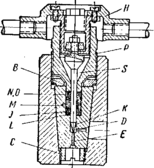 Вентиль со вторым уплотняющим конусом диаметр около 1,8 мм. Вращение головки H передается через шариковый подшипник на шпиндель S с конусом К. В качестве самоуплотнения применяется несколько модифицированное уплотнение Бриджмена. В стальную пластину L вставляется цилиндрический штифт /, который способствует уменьшению поверхности уплотнительной шайбы M. Две стальные пластинки образуют затвор уплотнения. С помощью гайки P уплотнение можно подвергнуть предварительному напряжению.