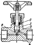Конус на конце шпинделя S давит вниз в направлении отверстия, прижимая таким образом металл к металлу. Конус D во всех случаях должен быть тверже, чем материал, в котором сделано отверстие В. Конус-D в большинстве случаев имеет угол 90°. Место уплотнения С должно представлять собой острый край и иметь маленький диаметр. Периодически рекомендуется прирабатывать место С, сильно завертывая шпиндель. Но при обычных работах не следует вентиль сильно затягивать, так как иначе место уплотнения слишком быстро деформируется, и вследствие этого поверхность соприкосновения возрастает. Тыльная отшлифованная часть шпинделя G уплотняется с помощью кожаных шайб или металлических прокладок, например свинцовых. Во многих случаях вместо металлических прокладок прекрасно служат уплотнения из асбестового шнура, пропитанного графитовой смазкой. Известны также конструкции вентилей, у которых уплотняющие прокладки можно заменять во время действия аппаратуры. Для этой цели предусмотрен второй конус вентиля. При обратном вращении шпинделя этот конус перекрывает сообщение с наружным пространством, что позволяет освободить верхнюю гайку и сменить набивку.