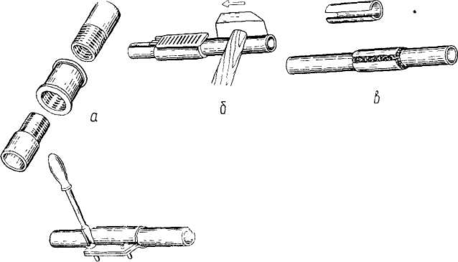 а — нарізною муфтою; б — муфтою з клиновою обоймою; в — зварюванням у гільзі: г — хомутом з гвинтами