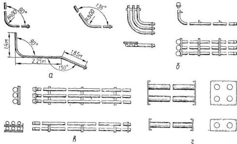 а — труби, зігнуті під нормалізованими кутами; б — пакети зігнутих труб; в — пакети і блоки прямих труб; є — блоки труб із спільними фланцями