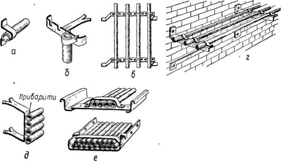 а — одиночної груби скобою з лапками; б — закріплювачем; в — кількох труб виносною скобою на дюбелях; г — на кронштейнах; д — на вмазуваній скобі з приварюванням до неї труб; є — пакетів труб у лотках