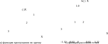 На рис.2 показан вид ФРТ для различных функций пропускания. Если пропускание уменьшается к краям зрачка (2), то центральный максимум ФРТ расширяется, а кольца исчезают. Если пропускание увеличивается к краям зрачка (3), то центральный максимум сужается, а интенсивность колец увеличивается. Эти изменения по-разному влияют на структуру изображения сложного объекта, и, в зависимости от требований, используются различные функции пропускания, “накладываемые” на область зрачка. Это явление называется аподизацией.