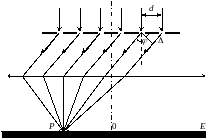 В точку P на екрані приходять промені від усіх щілин. Всі ці промені зсунуті по фазі на однакову величину
