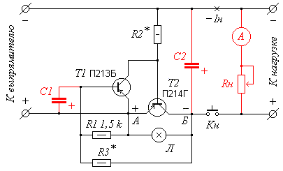 оказывается приложеной к лампе Л, которая загорается, указывая на перегрузку. Потребляемый при этом ток от выпрямителя в наихудшем случае (короткое замыкание) равен сумме токов лампы и открытого транзистора