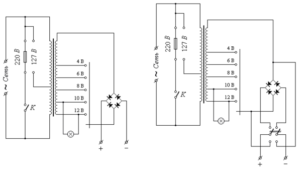 юбой школьный учитель, преподающий раздел физики «Электричество и магнетизм) в своей практике систематически использует такой широко известный источник постоянного напряжения, как ВС 4-12, позволяющий получать на выходе постоянное (пульсирующее) напряжение 4, 6, 8, 10 и 12 В при максимальном токе нагрузке 4 А. Принцип действия этого прибора очень прост и легко понятен из принципиальной схемы, показанной на рисунке 1 а.
