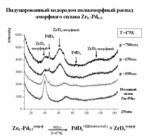 Изучена температурно-структурная эволюция аморфных сплавов при высоких давлениях (до 700 атм) и различных температурах в области стабильности аморфной фазы и обнаружено явление индуцированного водородом полиаморфного распада на гидриды компонентов с образованием метастабильного гидрида палладия с ОЦК структурой и аморфной фазы гидрида циркония (рис.2).