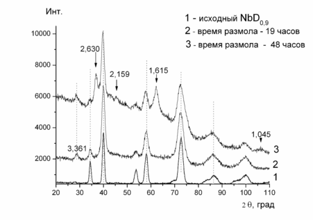 Для ответа на вопрос о том, какие переходы возможны в металлических гидридах при уменьшении размеров частиц методом дифракции нейтронов и рентгеновских лучей исследованы хорошо изученные ранее дейтериды ниобия (NbD0.95 и NbD1.84), тантала TaD0.75 и ванадия VD0.5, подвергнутые механоактивации (размолу в шаровых мельницах на воздухе). Обнаружено, что при таком воздействии в NbD0.95 происходит существенное изменение дифракционной картины (рис.1): уширение пиков, исчезновение сверхструктурных пиков, соответствующих звезде волнового вектора (½½0), появление новых сверхструктурных пиков типа (100), а также расщепление структурных пиков с с/а ~ 1,07. Полученные результаты можно объяснить образованием упорядоченной фазы типа Ме2D с октаэдрической координацией атомов водорода и остаточного разупорядоченного дейтерида МеD, аналогично равновесной диаграмме состояния гидрида ванадия. Аналогичное изменение координации атомов водорода в NbD уже наблюдалось ранее с помощью синхротронного излучения при 10-20 ГПа и было предсказано при высоких давлениях для различных систем Ме-Н. Однако оценки показывают, что при размере частиц, возникающих в NbD0.95 при механоактивации, лапласово давление недостаточно для реализации перехода, так что причины перехода связаны, возможно, с влиянием газовых примесей. В NbD1.84, состоящем из NbD2 и примеси NbD0.9, при механоактивации происходит аморфизация NbD2, а в NbD0.9 - переходы, описанные выше. Ситуация, аналогичная NbD0.95, имеет место и в TaD0.75, а в VD0.5 на ранних стадиях размола происходит образование разупорядоченного дейтерида с ГЦК решеткой.