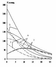 Расчеты проводились для магнитной системы, имеющей размеры RK = 44,5 см, c = 12 см, а=20 см, l=8 см. Силовое действие магнитной системы оценивалось по величине равной произведению модуля поля Н на его градиент. Было получено, что распределение модуля поля Н рассматриваемой нами магнитной системы характеризуется ярко выраженной угловой зависимостью. Поэтому расчет модуля поля Н проводился с шагом в 1° для точек, расположенных на двух разных дугах для всего периода повторяемости, который для нашей магнитной системы равен 30°. Первая дуга удалена от оси системы на расстояние r1=58 см, а вторая - на расстояние r2=59 см, при этом величина силы приписывалась среднему значению радиуса r=58,5 см. Все рассчитанные значения силы суммировались, полученная сумма делилась на количество точек счёта. Тем самым определялось значение средней по углу силы.