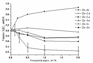 Рис. 5. Зависимость термо-ЭДС фольг сплавов бинарных систем на основе цинка от концентрации легирующего элемента.