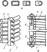 Индуктор имеет форму полого цилиндра и образован уложенными в виде спирали витками из медной трубки. Профили применяемых медных трубок показаны на рис. 5, а; равностенные трубки используют обычно для печей повышенной частоты, а разностенные — для печей промышленной частоты. Для исключения электрического пробоя витки, как правило, изолируют (на малых печах с небольшим напряжением достаточна воздушная изоляция, достигаемая зазором между витками в 10—20 мм). Широко применяют следующие виды изоляции: обмоточную, когда витки покрывают изоляционным лаком и затем обматывают лентой из диэлектрического материала (стеклоленты, микаленты); прокладочную, когда между покрытыми лаком витками закрепляют диэлектрические прокладки (например, из стеклотекстолита); напыленную, когда на поверхность трубки газопламенным или плазменным способом наносят слой окиси алюминия или двуокиси циркония с последующим покрытием лаком.