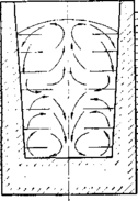 Характер циркуляционных потоков показан на рис. 2. Положительная сторона этого явления состоит в том, что благодаря перемешиванию ускоряются плавление и выравнивание состава и температуры металла, отрицательная — в том, что поверхность металла; получается выпуклой и может оголяться, так как шлак стекает к стенкам тигля. Интенсивность перемешивания приблизительно пропорциональна квадрату ампервитков (1п)- и обратно пропорциональна частоте питающего тока.