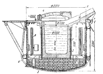 Индукционная плавильная установка состоит из печи с механизмом наклона и питающего электрооборудования (генератора повышенной частоты, батареи конденсаторов, щита управления и на крупных печах — автоматического регулятора электрического режима). Емкость индукционных печей достигает 60 т. Основные элементы печи — каркас, индуктор и огнеупорный тигель, который иногда закрывают крышкой.