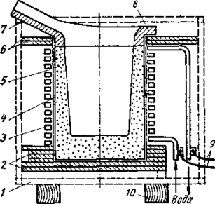 Футеровка индукционной печи состоит из следующих основных элементов: футеровки тигля, подовой плиты (подины), верхней керамики (воротника) со сливным носком. Подовая плита служит основанием для футеровки тигля и для индуктора; на средних и крупных печах ее выполняют из шамотных блоков или кирпичей, иногда на крупных печах — из огнеупорного бетона. На малых печах подовую плиту делают также из нескольких асбоцементных плит, уложенных одна на другую (см. рис. 3).