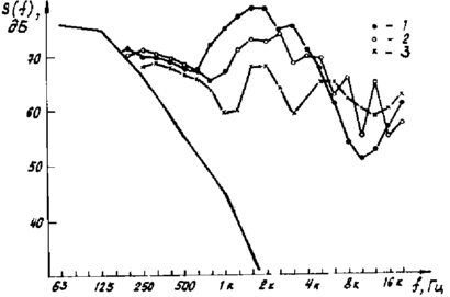 На рис. 7 показан пример спектральной обработки акустических сигналов, регистрируемых в условиях слабого дождя при воздействии МЛИ: 1 - 3 - импульсы МЛИ.