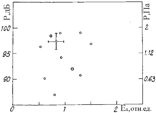 Регистрация ОА-сигналов при экспериментальном исследовании распространения МЛИ в условиях дождя показала следующее. Какой-либо явной зависимости генерируемого отдельными каплями дождя пикового звукового давления от энергии лазерного излучения не наблюдается, что следует из рис. 6.