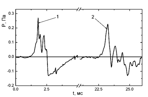 Подстановка исходных данных проведенных экспериментальных исследований в формулу показывает, что экспериментально регистрируемые и расчетные значения акустических давлений хорошо согласуются между собой: отличие составляет не более 30% в сторону увеличения для расчетных значений.