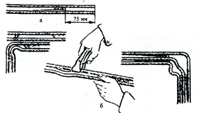 После правки и отрезания проводов их сматывают в бухточки. Прокладку проводов начинают с ближайшей к групповому щитку ответвительной коробки. На концах провода длиной 75 мм вырезают разделительное основание. У трехжильного провода разрезают также перемычку между второй и третьей жилами (рис. 3, а). Провод укладывают, начиная от коробки, по всему прямолинейному участку до места поворота трассы. При этом провод на другом конце временно закрепляют, тщательно выправляют, укладывают по всей длине участка и окончательно закрепляют на всем протяжении трассы. При прокладке плоских проводов с разделительной перегородкой (кроме проводов АППР) по сгораемым основаниям под них по всей длине прокладывают асбест толщиной не менее 3 мм с выступом от края провода не менее 10 мм.