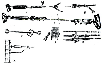 г — натяжной сквозной болт с крюком; д — натяжной сквозной болт с кольцом; е — прокладка изолированных проводов на тросовых подвесках с заглушкой проводов на изоляторах орешкового типа; ж — заземле ние троса проводов АРТ с помощью свободного конца петли