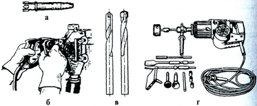а — шлямбур; б — бороздорез; в — бурик; г — фугальный электрический молоток с набором рабочего инструмента