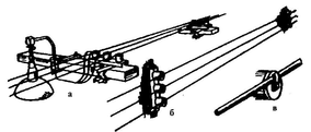 Провода закрепляют на штыревых изоляторах вязальной оцинкованной проволокой, на троллейных—промежуточными и концевыми держателями.