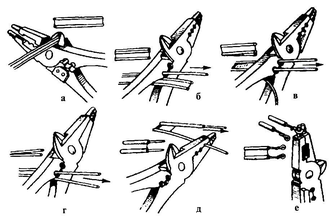 При разделке плоских проводов часто используют клещи КУ-1 или МБ-241, с помощью которых можно разрезать пленку, выкусывать ее, снимать изоляцию с концов проводов, зачищать жилы и изгибать колечки на концах проводов для подсоединения их под контактный винт (рис. 4, а—е).
