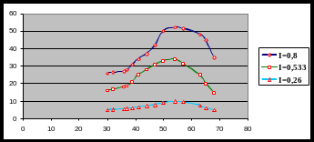 Оказалось, что амплитуда колебаний погруженного в магнитный наноколлоид объекта исследования, возникающих вследствие периодически действующего магнитного поля, зависит от частоты воздействующей силы (частоты переменного магнитного поля). Первоначальное увеличение частоты приводит к увеличению амплитуды, а при некотором значении частоты вынуждающей силы зависимость амплитуды от частоты имеет максимум, характерный для резонансных явлений. Было установлено, что при более высоком значении переменной силы максимум более выражен, кроме того, его крутизна зависит от вязкости жидкости и параметров колеблющегося тела. На рис.5 показаны графики зависимостей амплитуды колебаний ампулы от частоты поля при различных значениях величины импульса тока в намагничивающей системе.
