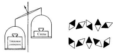 Рис.8. Весы символизируют борьбу между тепловым движением и силами, действующими внутри магнита. Если "перевешивает" тепловое движение, то элементарные магниты оказываются сориентированы в разных направлениях