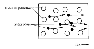 Рис.4. На этом рисунке схематически изображен микроскопический участок кристаллической решетки. Отдельные атомы металла показаны большими кружками. Вследствие теплового движения атомы металла непрерывно колеблются. Представленные маленькими черными кружками электроны сталкиваются с атомами решетки, что замедляет их движение и изменяет его траекторию; при этом часть своей энергии электроны отдают атомам решетки, в результате чего происходит постепенное нагревание металла и одновременное ослабление электрического тока.