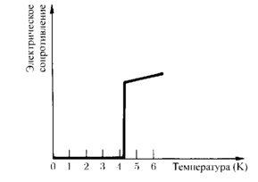 Рис. 5. График зависимости электрического сопротивления от температуры. При температуре ниже критической (здесь это 4, 2 К [абсолютная температура]) электрическое сопротивление полностью отсутствует; выше же этой отметки сопротивление принимает некоторое конечное значение