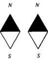 Ферромагнетики идеально подходят для изучения процессов, происходящих на микроскопическом уровне при фазовых переходах. В намагниченном, упорядоченном состоянии все элементарные магниты сориентированы в одном направлении, в то время как в разупорядоченной фазе они оказываются хаотически распределены по всем возможным направлениям. Причина возникновения этих двух абсолютно различных фаз - борьба двух разнородных физических сил. Одна из них воздействует на элементарные магниты, выстраивая их параллельно, в одном направлении. Другая сила основывается на тепловом, т.е. неупорядоченном, движении и стремится разупорядочить структуру магнита, хаотически распределив направления полюсов элементарных магнитов. Здесь, пожалуй, можно провести аналогию с весами: на одну чашу весов нагрузим тепловое движение, а на другую - силы, упорядочивающие расположение элементарных магнитов. Если большим "весом" обладает тепловое движение, то магнит оказывается в неупорядоченной фазе и на макроскопическом уровне теряет намагниченность, поскольку прекращается совокупное воздействие отдельных элементарных магнитов, направленное наружу (рис.8). Охладив магнитный брусок, мы существенно "облегчим" эту чашу весов, и преимущество получат силы, действующие внутри магнита. Весы тут же склонятся в другую сторону, и элементарные магниты снова расположатся стройными рядами (рис.9).