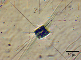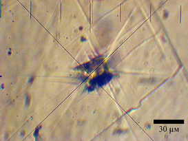 Рис.3. Ансамбль клиновидных двойников заклинившихся у отпечатка индентора после воздействия импульса МП и последующего «размагничивания» образца