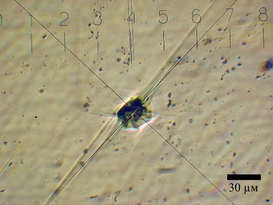 Клиновидные двойники системы {110} получались путем вдавливания стандартной алмазной пирамиды в плоскость спайности (111) кристаллов сурьмы. Исследования проводились с помощью микротвердомера ПМТ-3 с использованием специального устройства, изготовленного из неферромагнитных металлов, для нагружения образца в условиях приложения к нему МП. Вектор магнитной индукции лежал в плоскости спайности (111) кристаллов висмута. Для размагничивания образцы помещались внутрь соленоида (не соприкасаясь) обмотка которого содержала 1800 витков для напряжения электросети 220 В. Затем образцы плавно удалялись на расстояние 1м от соленоида, после чего соленоид выключался. Промежуток времени после окончания воздействия импульса постоянного однородно МП был одинаков для всех образцов (размагничиваемых и не размагничиваемых). После снятия нагрузки проводилось фотографирование ансамбля клиновидных двойников у отпечатка алмазного индентора.