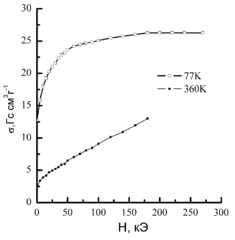 При Т=360 К ферромагнитная матрица разупорядочена. Остаточная намагниченность определяется высокотемпературной кластерной фазой 2, образуемой магнитоактивными атомами Mn I и Mn II с антипараллельно направленными магнитными моментами. Намагниченность этой фазы линейно увеличивается с полем, магнитное насыщение не достигается вплоть до H=180 кЭ. Такая полевая зависимость характерна для систем магнитных моментов с неупорядоченной периодической структурой, таких как кластерные фазы, спиновые стекла и другие [6].