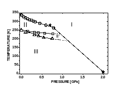 Многие соли пиридина относятся к группе молекулярно-ионных кристаллов с межионными водородными связями. В зависимости от симметрии и размера анионов, эти соединения проявляют большое разнообразие интересных явлений – фазовые переходы, сегнетоэлектричество и динамический ориентационный беспорядок катионов пиридина [1-4]. Сегнетоэлектрическое состояние было обнаружено в тетрафторборате пиридина PyHBF4 (C5H5NHBF4) [1], хлорокислом пиридине PyHClO4 [2], рениевокислом пиридине PyHReO4 [3] и йодокислом пиридине PyHIO4 [4]. Интерес к изучению последних двух вышеперечисленных соединений связан с тем, что их температура Кюри близка к комнатной температуре. Однако, поведение параметров элементарной ячейки и межатомных связей дейтерированного рениевокислого пиридина (d5PyH)ReO4 при высоком давлении не исследовались. Зависимость параметров элементарной ячейки от давления можно исследовать с помощью рентгеновской дифракции. Однако этот метод не позволяет определить положение атомов водорода в структуре, особенно если там наблюдается ориентационный беспорядок водородосодержащих ионов. Эту информацию можно получить с помощью метода дифракции нейтронов. Выбор для исследований дейтерированного соединения C5D5NHReO4, изоструктурного с C5H5NHReO4, обусловлен лучшими характеристиками атомов дейтерия для экспериментов по нейтронной дифракции по сравнению с атомами водорода, которые имеют очень большое сечение некогерентного рассеяния нейтронов. Исследования кристаллической структуры дейтерированного рениевокислого пиридина (d5PyH)ReO4 было проведено с помощью рентгеновской дифракции при давлениях до 3.5 ГПа при комнатной температуре и нейтронной дифракции при высоких давлениях до 2.0 ГПа и низких температурах до 10 К [5]. Обнаружено подавление сегнетоэлектрической фазы II под высоким давлением и стабилизация фазы высокого давления I. Характер фазовой диаграммы (d5PyH)ReO4 указывает на существование тройной критической точки для фаз I, II и III при давлении около 1.2 ГПа (рисунок 1).