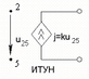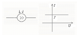 2. Источник тока j, J– это такой элемент, через который при любом напряжении между его зажимами проходит один и тот же ток равный величине источника тока. Если величина источника тока равна 0 (j=0), то i = j = u/R = 0, то при любом напряжении ток на этом участке будет равен нулю (разрыв цепи). Поэтому считают, что внутреннее сопротивление источника тока бесконечно: Rвн j =