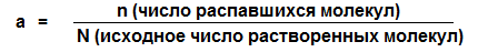 Степень диссоциации а – это отношение числа молекул, распавшихся на ионы, к исходному числу молекул растворенного вещества: