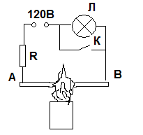 Стеклянная палочка АВ включена в осветительную сеть через реостат R. Пока палочка холодная, ток в цепи ничтожный из-за высокого сопротивления стекла. Если палочку нагреть газовой горелкой до температуры 300-400 0С, то ее сопротивление упадет до нескольких десятков омов и нить лампочки Л раскалится. Теперь можно закоротить лампочку ключом К. При этом сопротивление цепи уменьшится, и сила тока возрастет. В таких условиях палочка будет эффективно нагреваться электрическим током и раскаляться до яркого свечения, даже если убрать горелку1.