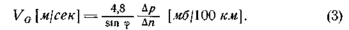 Подставим в формулу (2) числовые значения для плотности воздуха при стандартных условиях давления и температуры на уровне моря и для угловой скорости вращения Земли; выразим скорость ветра в метрах в секунду, а барический градиент — в миллибарах на 100 км. Тогда получим формулу (2) в рабочем виде, удобном для определения скорости геострофического ветра (на уровне моря) по величине градиента: