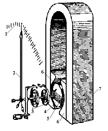 Катушка 5 с числом витков w и площадью витка s находится в магнитном зазоре с равномерным радиальным магнитным полем. Поле в зазоре создается с помощью магнитной системы, состоящей из постоянного магнита 7, полюсных наконечников с цилиндрической расточкой 6 и цилиндрического сердечника 4 из магнитомягкого материала. Благодаря введению в магнитную систему сердечника 4, поле в зазоре, где движется рамка, получается однородным. Для изготовления магнита 7 используют материалы с большой коэрцитивной силой, чаще всего железоникельалюминиево-кобальтовые сплавы. Магнитопроводы и полюсные наконечники выполняют из магнитомягких материалов, чаще всего из низкоуглеродистых электротехнических сталей. Подвижная часть крепятся на полуосях и керновых опорах (в высокочувствительных приборах - на растяжках и подвесах). Противодействующий момент может создаваться механическим (с помощью спиральных пружин 3) или электрическим путем. Катушка 5 наматывается на легком алюминиевом каркасе и жестко крепится на полуосях. При движении катушки в магнитном зазоре в каркасе возникают вихревые токи, создающие момент успокоения . Если получаемый таким образом момент успокоения недостаточно велик, то на каркас катушки дополнительно наматывается необходимое количество короткозамкнутых витков, увеличивающих момент успокоения до нужного значения.