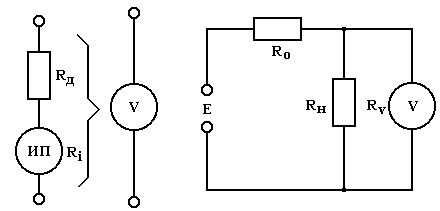 Вольтметры. Магнитоэлектрические вольтметры образуются путем включения измерительного преобразователя последовательно с добавочным резистором RД (рисунок 2.4,a). Полученный таким образом прибор подключается параллельно участку цепи, падение напряжения на котором необходимо измерить (рисунок 2.4,б).