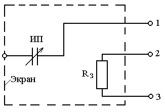 Для измерения низких напряжений (от десятков до сотен вольт) используются преимущественно вольтметры, созданные на базе ИП с изменяющейся активной площадью пластин (см. рисунок 6,а). При этом для обеспечения достаточной чувствительности расстояние между подвижными и неподвижными пластинами делается очень малым (десятые доли миллиметра) и при случайных ударах, толчках, вибрации и т.д. возникает опасность короткого замыкания пластин, а значит и источника измеряемого напряжения. Для предохранения преобразователя от выхода из строя вследствие протекания через него больших токов при коротком замыкании внутрь низковольтных вольтметров встраивается защитный резистор, ограничивающий эти токи (рисунок 7).