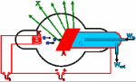 Схематическое изображение рентгеновской трубки. X - рентгеновские лучи, K - катод, А - анод (иногда называемый антикатодом), С - теплоотвод, Uh - напряжение накала катода, Ua - ускоряющее напряжение, Win - впуск водяного охлаждения, Wout - выпуск водяного охлаждения (см. рентгеновская трубка).