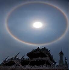 Гало (от греч. χαλοσ — «круг», «диск»; также а́ура, нимб, орео́л) - это явление преломления и отражения света в ледяных кристалликах облаков верхнего яруса; представляют собой светлые или радужные круги вокруг Солнца или Луны, отделенные от светила темным промежутком. Гало часто наблюдаются в передней части циклонов (в перисто-слоистых облаках на высоте 5-10 км их теплого фронта) и поэтому могут служить признаком их приближения. Иногда можно наблюдать и лунные гало.