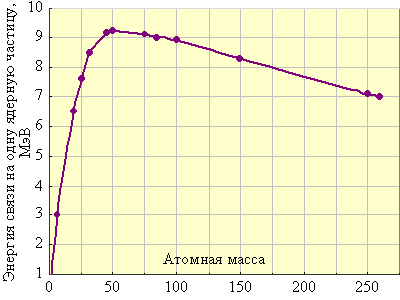 На рис. 1 видно, что максимум устойчивости приходится на массовое число ~50. Это означает, что ядра легких элементов при слиянии достигают большей устойчивости (ядерный синтез), а ядра тяжелых элементов подвержены радиоактивному распаду или ядерному делению на два (три) фрагмента.