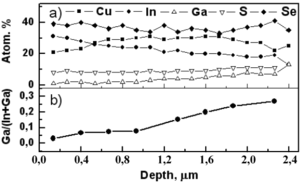 Прямозонный полупроводник CuInSe2 (CIS) и твердые растворы на его основе признаны наиболее перспективными материалами для создания солнечных элементов (CЭ) нового поколения – высокоэффективных тонкопленочных фотопреобразователей большой площади. К настоящему времени эффективность преобразования СЭ с использованием поликристаллической пленки Cu (In, Ga) Se2 (CIGS) в качестве поглощающего слоя достигла 19,2% [1]. CЭ с наиболее высокой эффективностью и промышленные модули созданы на основе этих материалов с соотношением [Ga]/([Ga]+[In]) порядка 25–30%, имеющих ширину запрещенной зоны не более 1.2 эВ [2]. С целью оптимизации свойств CIGS поглощающего слоя ведутся исследования по получению пленок этих материалов с шириной запрещенной зоны 1.5 эВ, близкой к оптимуму солнечного излучения. Однако, решение этой задачи путем увеличения концентрации Ga в CIGS слое сопряжено с ухудшением микроструктурных характеристик оптически активного слоя. Кроме того, при использовании метода селенизации металлических слоев Cu-In-Ga образование однофазного соединения CuInxGa1-xSe2 протекает через сложные химические взаимодействия бинарных фаз с различными скоростями реакции, приводящими к сегрегации галлия у подложки и разделению CuGaSe2 и CuInSe2 фаз [3]. Следствием этих процессов является формирование поглощающего слоя с нежелательным профилем ширины запрещенной зоны по глубине и снижение эффективности преобразования СЭ. Частично эта проблема решается сульфиризацией синтезированных CIGS слоев. Однако для процесса сульфиризации более характерно образование в приповерхностной области широкозонного соединения CuInS2, чем выравнивание профиля концентрации галлия.