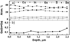 Типичные для тонких плёнок CIGS, синтезированных при температуре рекристаллизации 400 °С, SEM-изображение скола и распределение элементов по глубине слоя и представлены на рисунках. 2 (а) и 2 (б), соответственно. О сегрегации Ga к подложке свидетельствует характерный градиент соотношения Ga/(In+Ga) – (Рис. 2 (б).