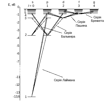 електрони в атомах водню знаходяться лише в дискретних енергетичних станах. При переході електронів з одних станів в інші випромінюється або поглинається фотон;