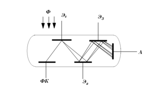 . Падая на него, фотоэлектроны вызывают эмиссию вторичных электронов, причем в определенных условиях эта вторичная эмиссия может в несколько раз превышать первоначальный поток фотоэлектронов. Конфигурация электродов такова, что большинство фотоэлектронов попадает на электрод